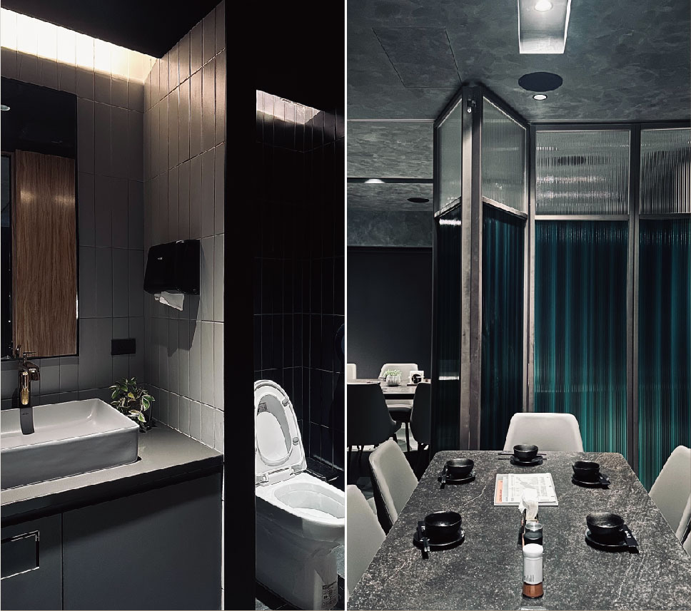 用餐區以灰黑色搭配湖水綠材質界定空間使用性,半開放6人座位區以黑色金屬框架富士藤編隔屏分隔,空間布局產生隔離與聯繫的趣味性,形塑出現代日式品味的用餐環境。